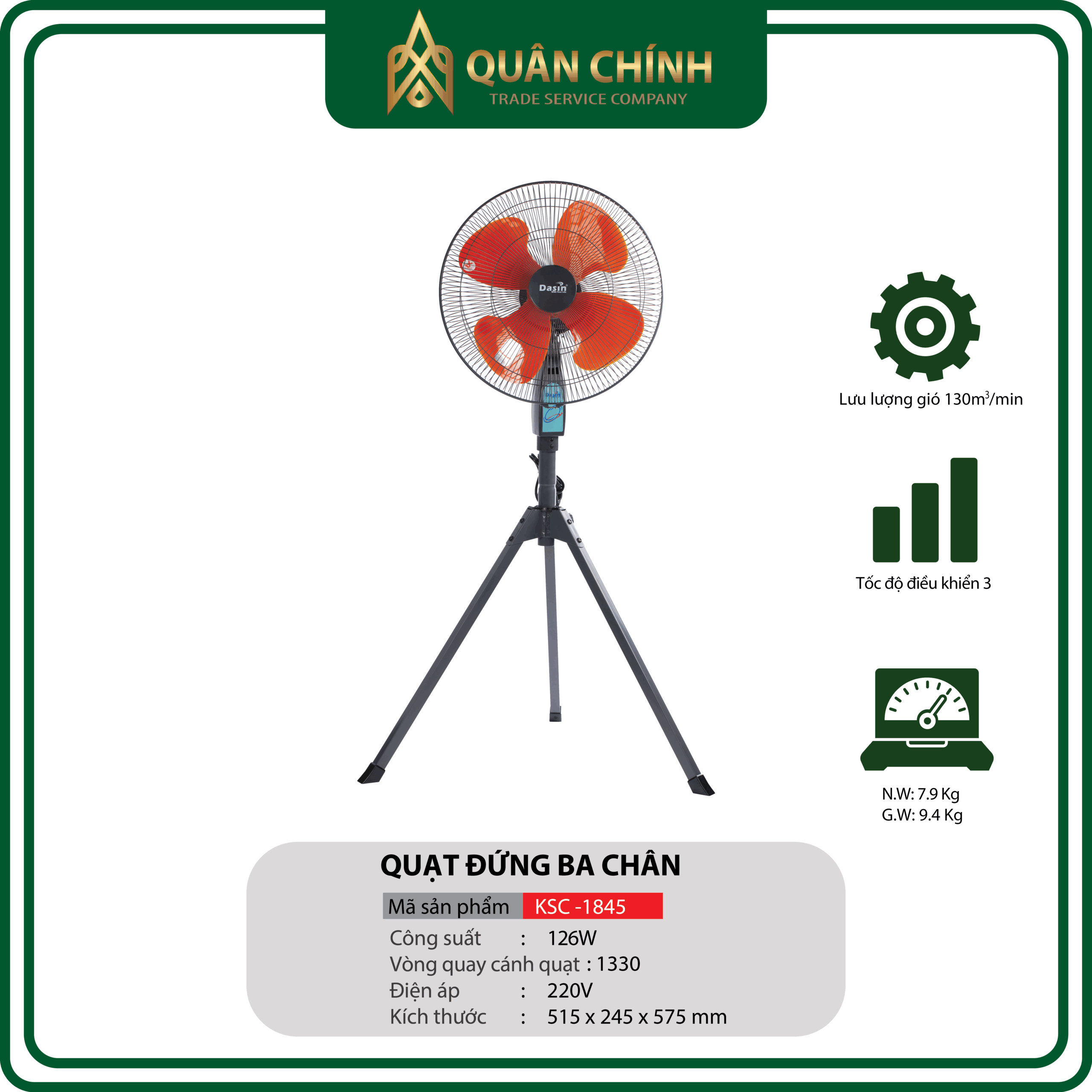 Quạt đứng KSC – 1845 thiết kế chân trụ đứng vững chắc, tiết kiệm điện năng, phù hợp cho không gian mở lớn như kho hàng, nhà xưởng, quá cà phê, khu vui chơi,…
